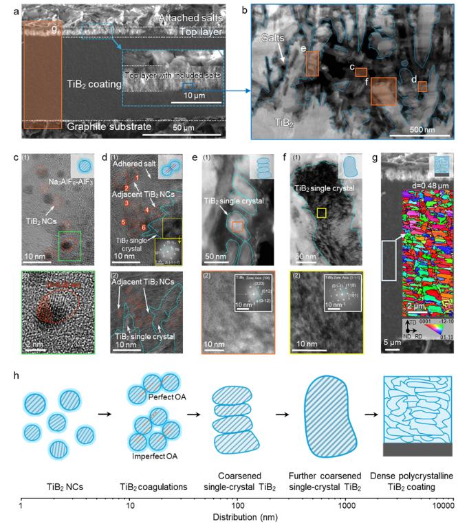 团队进一步采用所制备的TiB2涂层阴极开展铝电解实验。电解持续48 h,电流效率约90%,槽电压稳定在2.5–3.5 V范围。电解后表征显示阴极尺寸稳定,涂层保持良好结构完整性,未见裂纹及钠、铝渗透迹象;测得腐蚀速率约0.09 mm·a⁻¹。研究认为,该低腐蚀速率得益于涂层的完全致密化有效阻隔熔盐/铝液渗透,以及极低氧含量显著降低氧化物生成并减轻晶界侵蚀。为阐明超小TiB2纳米颗粒如何在熔盐电场作用下形成全致密涂层,研究克服高温熔盐电泳沉积过程难以原位观察的技术瓶颈,采用“电极表面粘附熔盐瞬时凝固”方法对涂层生长过程进行“定格”。结果揭示了涂层致密化形成的关键路径:TiB2纳米颗粒在电场诱导下发生取向附着(oriented attachment,OA)结晶,随后粗化形成数百纳米尺度的单晶晶粒,并进一步生长成为致密的微米级多晶涂层(图3)。该机理认识为高温熔盐体系中纳米颗粒的外场组装与致密涂层构筑提供了重要参考。