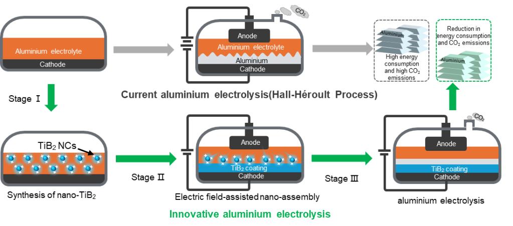 在能源转型与“双碳”目标背景下,电解铝行业可持续发展面临能耗高、碳排放强度大的突出挑战。铝作为光伏、风电等清洁能源产业链中的关键金属,需求持续增长,但传统Hall-Héroult法电解过程的高能耗与高排放已成为有色冶金行业绿色低碳转型的重要瓶颈。以TiB2涂层阴极替代传统碳阴极,被认为是实现电解铝工艺节能降碳的重要路径之一。TiB2具有优良导电性、耐腐蚀性以及对铝液的良好润湿性,但现有涂层体系普遍存在抗热震能力不足、易开裂等问题,限制其工业应用。因此,发展可在铝电解槽中原位制备以降低温度波动导致失效风险的TiB2涂层阴极新技术具有重要意义。基于团队前期发现的“熔盐中纳米颗粒电泳沉积”现象及提出的“熔盐电泳沉积制备涂层”方法,该研究开发了在冰晶石基熔盐中电泳沉积原位制备TiB2涂层阴极的新工艺(图1)。