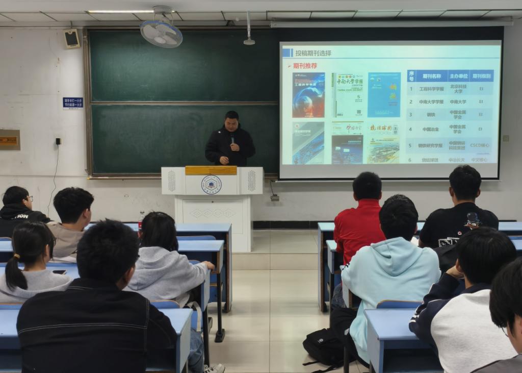 博士研究生赵贺喜、范春龙担任主讲嘉宾。他们结合自身丰富的科研实践经历,分别以《科技论文写作及投稿》和《专利基础知识》为题,从科研选题、高质量论文撰写、专利申请与保护等方面进行了详细讲解。