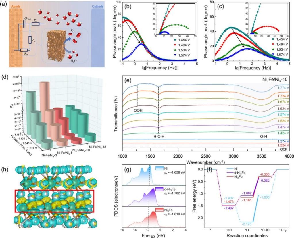 析氧(OER)过程中,精确调控电子构型与合理设计催化材料表面形态对提升电催化效率至关重要。研究团队通过一步熔盐电沉积方法,同步调控电子构型与微观结构形态,成功制备出富含缺陷的多孔Fe-Ni合金电极。通过控制Fe-Ni合金的原位电化学生长形成多孔通道,同时借助应变释放机制引入位错与孪晶缺陷。电极表面丰富的多孔通道为反应提供了丰富的活性位点,并促进气泡及时释放。同时,缺陷诱导的局部晶格应变优化了Ni的d带中心,平衡了中间体的吸附/脱附能,使其在碱性条件下展现出优异的OER性能,表现为低至265 mV的过电位和500 mA·cm-2大电流密度下超过120小时的稳定运行寿命。本研究通过形态结构与缺陷配置的双重优化,性能可比肩贵金属催化剂,为开发高效氧析出催化剂提供了新路径。