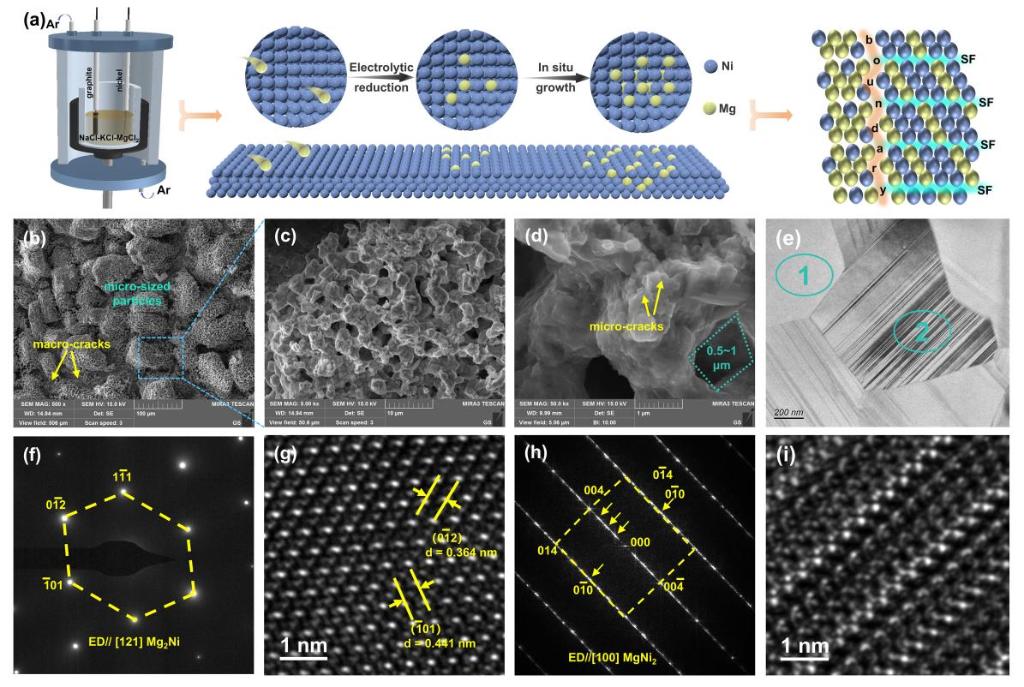 异相界和堆垛缺陷因其独特调节电子结构与d带中心的能力,是提高HER活性的有效手段。然而,由于两者调控机制存在差异,通过温和合成方法将这两种策略融合到一个简单的合成框架中仍存在较大挑战。团队创新性地采用熔盐电沉积策略,在镍基底上原位制备出富含堆垛缺陷的异质Mg-Ni合金(Mg2Ni/MgNi2)。该结构所构建的相界,充当了电子高效输运的“桥梁”,有效调控了电子结构与d带中心,显著提升了HER活性。采用该方法制备的Mg-Ni合金电极在碱性条件下仅需69.2 mV过电位即可驱动高效析氢反应,并在600 mA·cm-2的高电流密度下保持稳定运行。该研究不仅打破了“镁不适合HER”的传统观念,更重要的是为通过“相工程-缺陷工程”协同策略设计高效非贵金属催化剂提供了全新范式。